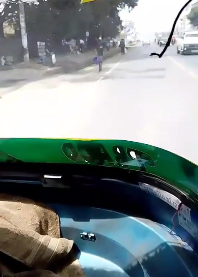 The view from the interior of a green and yellow auto rickshaw, also known as a tuk-tuk, shows a bright, sunlit road ahead with cars and pedestrians. On the left side of the road, a group of people stand near some trees, some are walking along the side of the road. Other cars are visible driving in the distance. Inside the tuk-tuk, a blue passenger area is seen with a brown cloth on the seat. The tuk-tuk is in motion, moving forward on the road.