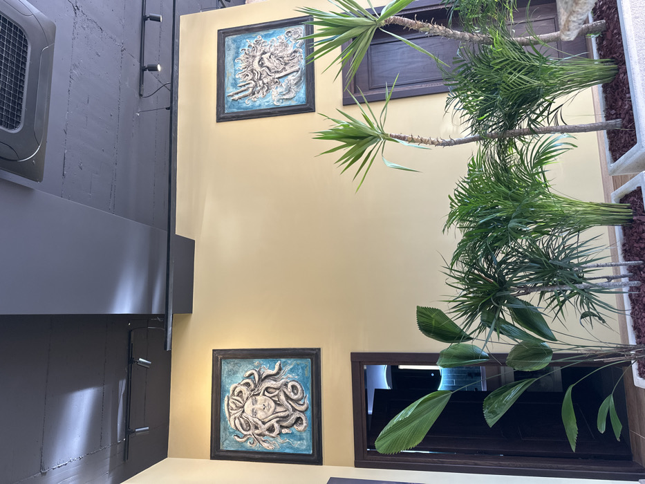 This interior image depicts a well-lit commercial space in Ulcinj - Ulqin, Montenegro. The walls are painted a uniform light yellow or beige. The ceiling is a dark grey or black, featuring exposed concrete textures in some sections and a prominent black rectangular beam. A silver-grey ceiling-mounted air conditioning unit is visible on the upper right, and a black track lighting system with multiple spotlights runs along the ceiling. Two framed artworks hang on the yellow wall. The artwork on the left displays a bas-relief or sculpture of Medusa's head with serpentine hair, rendered in light tones against a textured blue-green background, enclosed in a dark frame. The artwork on the right features a similar bas-relief or sculpture of a bearded male figure holding a trident, consistent with depictions of Poseidon, also in light tones against a textured blue-green background within a dark frame. In the lower foreground, a collection of various green plants is arranged in white rectangular planters. These include several tall, slender palm-like plants, a broad-leaf plant with prominent veins, and other spiky-leaved plants. The planters contain reddish-brown mulch. Two dark brown, framed doors are present on the lower wall. The door on the left is partially open, revealing an interior space with blue-tiled walls and what appears to be bright artificial lighting. The door on the right is closed. No individuals are present in the scene, and no actions or interactions are depicted. The environment appears clean and intentionally designed.