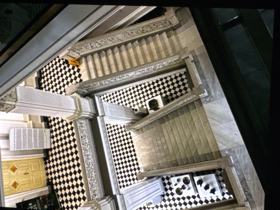 An overhead shot shows a building's interior, featuring a black and white checkered floor pattern. Ornate architectural details, including columns and decorative moldings, frame the space. A grand staircase leads upward, its steps a solid color contrasting with the checkered flooring. Furniture and objects are scattered throughout the scene, including a display case with objects, a closed set of double doors, and a bust sculpture.