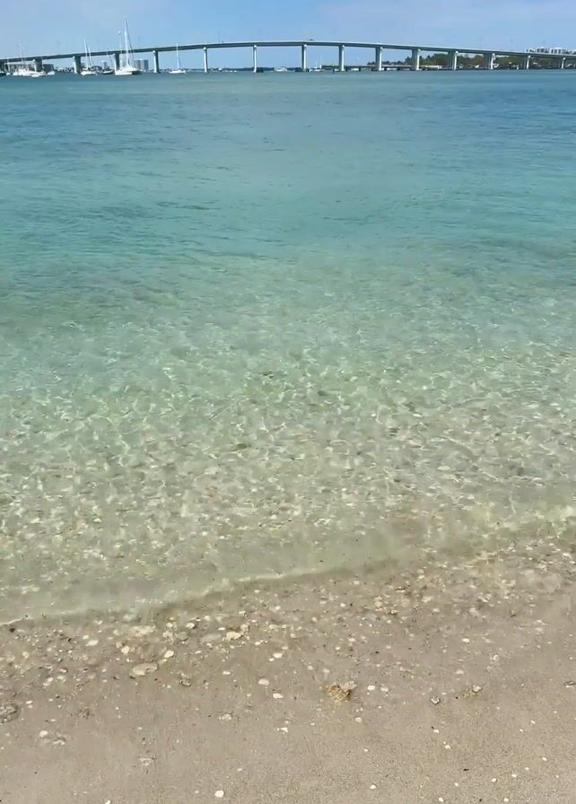 The short video shows a tranquil scene of a beach. The water is clear and turquoise. Small waves are gently lapping onto the shore. In the distance, a long bridge stretches across the water, connecting to land on both sides. A few sailboats are visible beneath the bridge. The sand on the beach is light brown and dotted with small shells. The sky is blue with some wispy clouds.