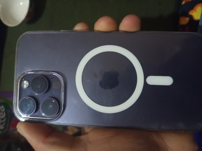 A human hand with light to medium brown skin holds a dark purple Apple iPhone, encased in a clear protective cover, oriented vertically to display its rear. The phone features a triple-lens camera system with a flash and what appears to be a LiDAR sensor in the upper left corner. A white circular MagSafe ring with a white vertical indicator line is centered on the phone's back, obscuring a faintly visible Apple logo. The background is out of focus, showing partial objects including a green container with white text in the upper left, a white ceramic bowl with a red rim in the upper right, and a multicolored patterned fabric (dark blue, red, yellow) in the lower right. The scene is indoors. The location is in the city of Unknown, Unknown.