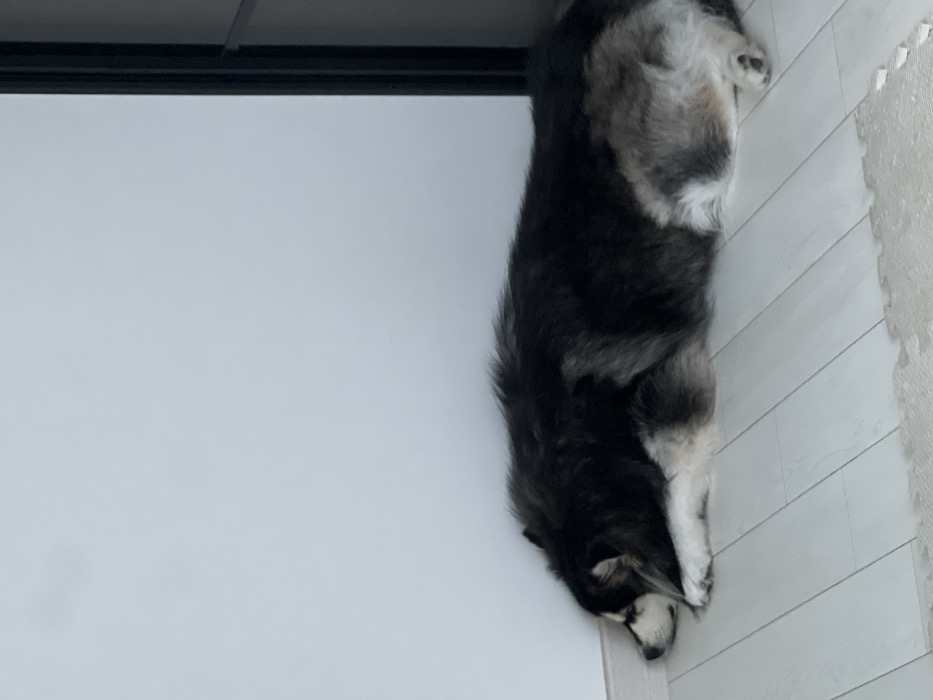- "A large domestic dog, with thick black, white, and grey fur, lies on its left side, appearing to sleep or rest, on light-colored plank flooring" by FM-RJwHC2, licensed under CC BY 4.0