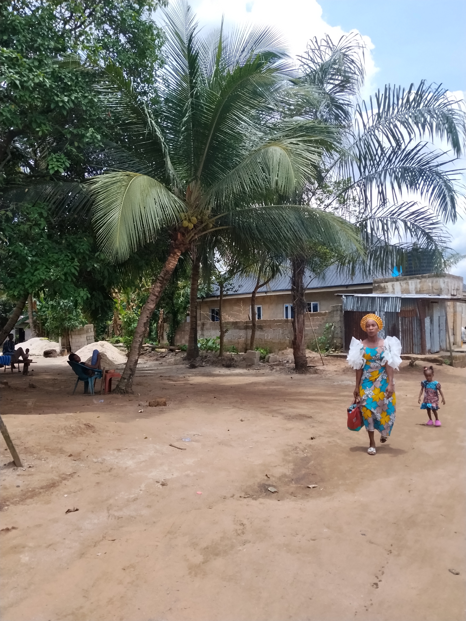 The image depicts a daytime scene in what appears to be a residential area in Aba, Nigeria. The ground is sandy and bare, with scattered debris. The landscape includes lush greenery, with several palm trees and other trees providing shade. In the background, there are simple buildings constructed with a mix of brick and corrugated metal roofing. Some structures appear to be in a state of disrepair. In the foreground, a woman and a young child are walking towards the viewer. The woman is wearing a colorful patterned dress with large white ruffled sleeves and a matching headwrap. She carries a red bag in her left hand. The child is wearing a dress with a similar pattern and pink shoes. To the left of the frame, two men are seated outdoors, one on a bench and another slumped in a plastic chair. There is a mound of sand nearby. The scene suggests a relaxed, informal setting within a tropical environment.