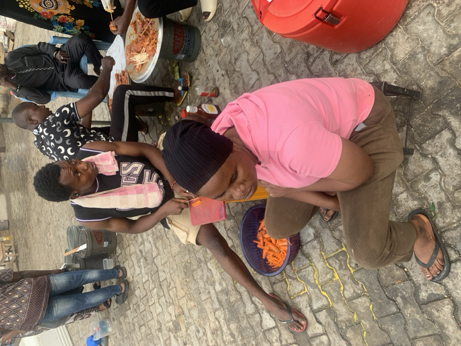 Outdoor scene shows several individuals engaged in food preparation. A woman in a pink shirt and black beanie slices carrots, alongside a man with a towel draped around his neck. Others are seated at a table, possibly preparing meat skewers. A red insulated container and buckets are nearby, suggesting they are preparing food for an event or sale. The area is paved, with various items scattered around, indicating a makeshift food preparation area.