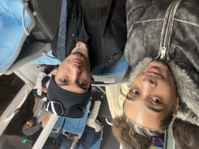 Two men sit on a public transportation vehicle, likely a bus or train, facing the camera. The man on the left wears a black beanie, sunglasses perched on top, a silver chain, and a vest over a blue shirt. The man on the right sports a leather jacket with fur trim around the collar. People sit behind them in the blue seats. The image has been rotated to an odd angle.