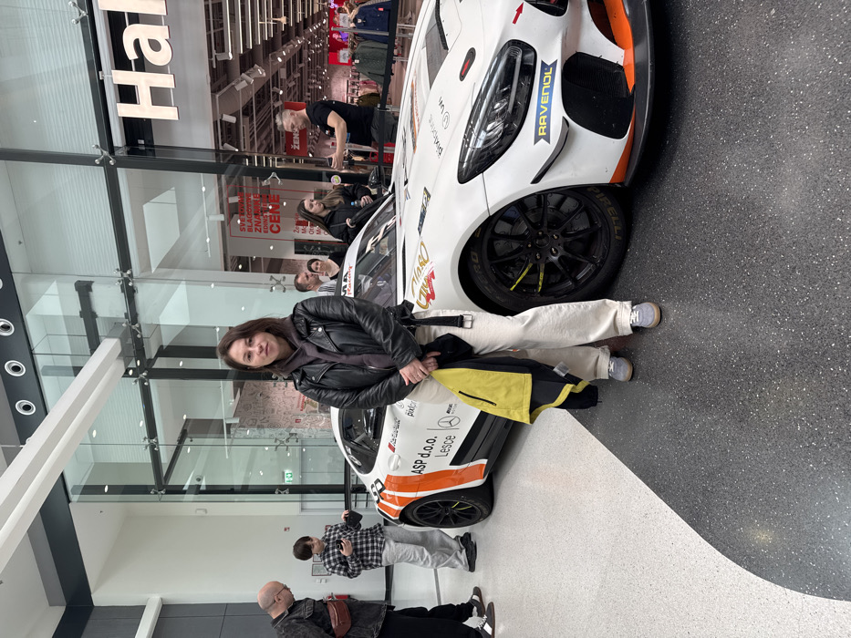 An indoor scene within the Aleja Ljubljana shopping mall in Ljubljana, Slovenia, displays a promotional event. A woman stands in the center-left foreground, facing the camera directly. She is dressed in a black leather jacket over a dark hoodie, light-colored wide-leg trousers, and light gray sneakers, holding a yellow and black jacket in front of her. Behind the woman, a white Mercedes-AMG GT3 racing car is prominently displayed. The car features an orange and black livery with sponsor decals including "ASP d.o.o. Lesce," "pixforent," "AMG MOTOR," "Pirelli," and "Ravenol." Its wheels are black multi-spoke with bright yellow accents. To the far left, a man in a dark jacket and dark pants with sandals and socks is partially visible, looking downwards. Behind him, a young male in a plaid shirt and light gray sweatpants is observed looking at a smartphone. In the background, to the right of the racing car, a group of people is gathered near a storefront. A man in a black t-shirt gestures while speaking to two women, one of whom holds a water bottle. The flooring consists of a two-tone speckled terrazzo, light gray on the left and dark gray on the right, separated by a distinct curved line. The background features large glass storefronts and modern overhead lighting. A partially visible store sign on the right reads "Hal" (part of "Hala"), and a red sign with Slovenian text "VSE CENE BLAGOVNE ZNAMKE..." (All prices brand names...) is also visible. Clothing racks are discernible inside the "Hala" store through its glass entrance.