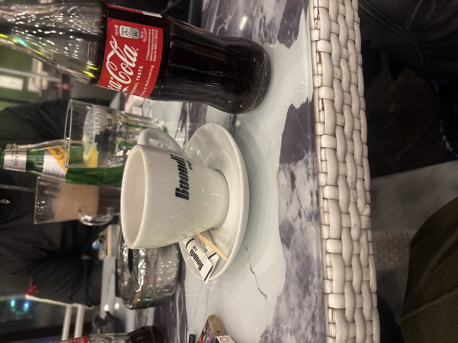 The image depicts a close-up, elevated view of a table in a cafe located in Asenovgrad, Bulgaria. The foreground features a white, woven wicker-style table base supporting a glass tabletop with a grey and white marbled or abstract pattern underneath. On the table, an empty white espresso cup, branded "Buondi Caffe," rests on a matching saucer. Beside it are two white sugar packets, also branded "Buondi Caffe," and a small wooden stir stick. To the left of the cup, a silver-colored metal ashtray is visible, and further left, a multicolored lighter is partially visible. To the right of the Buondi cup, a 250 ml glass bottle of Coca-Cola stands upright, displaying a red label with "Coca-Cola Original Taste" and Bulgarian text indicating nutritional information. Behind the Buondi cup, a tall glass of water with a lemon slice and "MONY" branding is present, next to a green glass bottle of Schweppes Soda. Further left and in the background, a tall glass with a dark liquid is visible. Two individuals are partially visible in the background and foreground. One person wears a dark jacket with a red logo on the left chest, and another wears dark trousers, indicating a seated position. No specific interactions are depicted, and the overall scene suggests a casual cafe setting with beverages and smoking accessories.