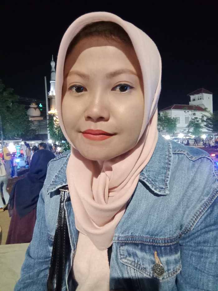 A young adult female is depicted in a close-up, nighttime portrait, looking directly at the camera. She wears a light pink hijab, red lipstick, and a blue denim jacket. A black strap is visible over her right shoulder. The background reveals an urban setting in Kaliwungu, Indonesia, illuminated by artificial lights. To the left, a tall, white mosque minaret is visible, partially obscured, with green lights near its base, alongside a white mosque dome. To the right, a multi-story white building with a red-tiled roof and a prominent square tower is present. Below these structures, a blurred crowd of individuals is visible, suggesting a public gathering or market scene. Trees are also discernible in the background.