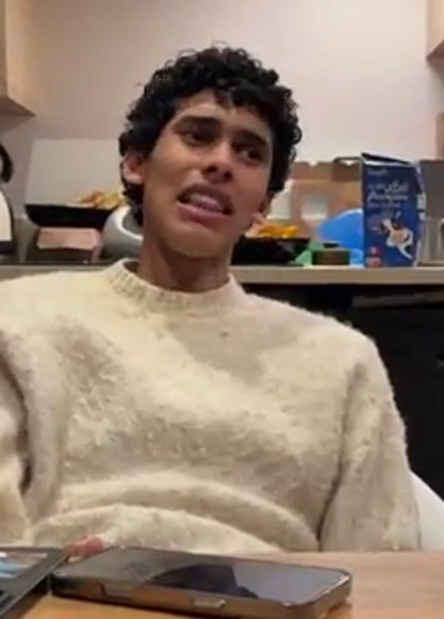 A young man is sitting at a wooden table in a kitchen. He is wearing a cream-colored sweater and has dark, curly hair. There are two iPhones, some earphones, and an ID badge on the table in front of him. He is looking to his right and talking, gesturing with his right hand. The kitchen has black cabinets, a microwave, a kettle, and other kitchen items on the counter behind him.