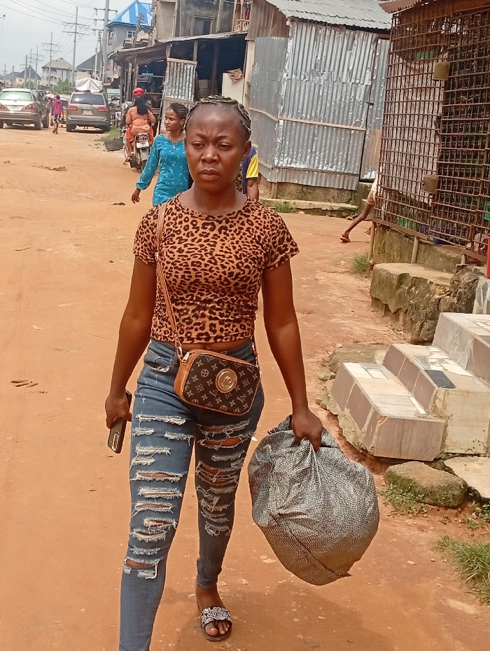 The image depicts a street scene in Umuode, Nigeria. In the foreground, a woman of apparent African descent walks towards the viewer on a reddish-brown dirt road. She wears a leopard-print short-sleeved top, distressed blue jeans, and dark slide sandals. A brown monogrammed shoulder bag with a circular gold emblem is slung across her body. She holds a dark-colored smartphone in her left hand and a large, silver-patterned bag in her right hand. Her expression is neutral. In the midground, other pedestrians are visible, including a woman in a light blue dress walking behind the primary subject. Further down the unpaved road, several vehicles, including sedans and a minivan, are parked or in motion. Utility poles with overhead wires line the left side of the street, accompanied by various buildings, some multi-story. On the right side of the image, the immediate roadside features rough-hewn concrete blocks and a concrete structure. Behind this, buildings constructed with corrugated metal sheets are visible, along with a dark metallic grid or fence. The sky overhead is overcast.
