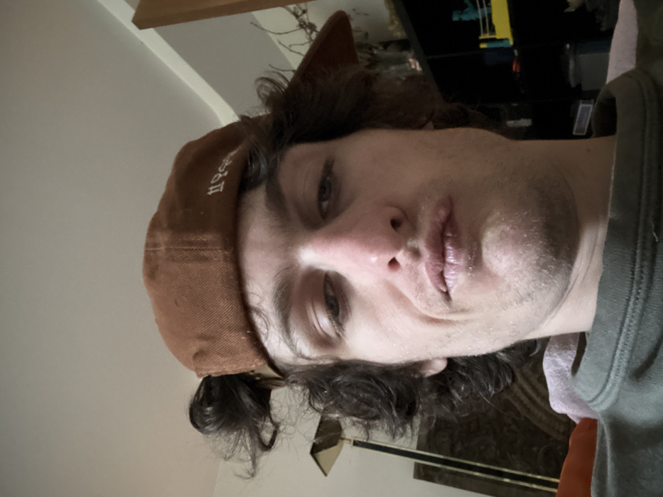 An image captured in Vincennes, France, depicts a male subject in a close-up, head-and-shoulders frame. The subject, an adult male with curly dark hair, wears a brown baseball cap reversed, from which a small, messy bun of hair protrudes through the rear opening. He has hazel eyes, a prominent nose, and full lips pursed into a slight pout. Light stubble covers his chin and jawline. He is dressed in a green crew-neck garment, with a light-colored fabric partially visible over his left shoulder. The background indicates an indoor residential setting. To the left, a brass-toned floor lamp with a rectangular shade is visible, alongside an obscured dark object. To the right, a dark shelving unit holds various items, including a blue wrestling figure within a yellow ring. Dried branches or decorative elements are visible above the shelving unit. The ceiling is light-colored, and a light-colored wall with a vertical architectural feature is present. The image is a self-portrait, taken from a slightly upward angle.