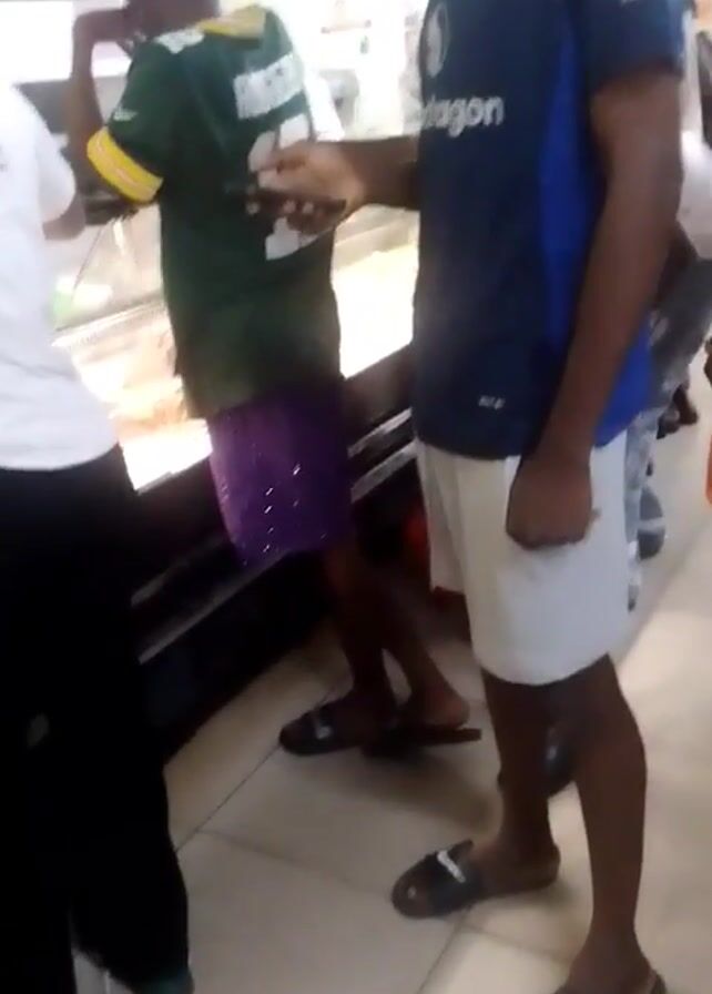 Here is a detailed description of the video: The video appears to be taken inside a store. Several individuals are present, including one wearing a green and yellow sports jersey with a purple skirt, another in a blue and black soccer jersey with white shorts, and another in black pants and a white shirt. People are milling around, and some seem to be looking at the products displayed in a glass case. The camera pans to showcase a display of juice boxes stacked on top of each other. The lighting seems adequate, and the tiles on the floor are visible.