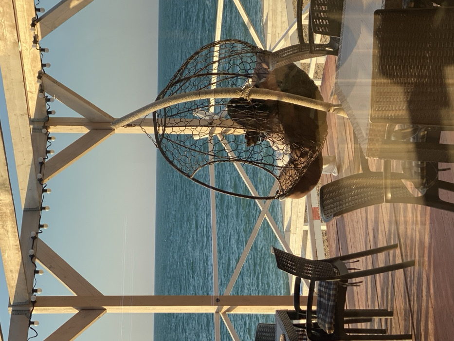The image displays an outdoor terrace located in Sevastopol, Ukraine, overlooking a body of water. A wooden pergola structure, illuminated by string lights, provides an overhead frame. The terrace features reddish-brown decking and is bordered by a white wooden railing that separates it from a narrow sandy beach and the blue-green sea beyond. In the foreground, multiple dark-colored chairs and tables are visible, some with plaid cushions. A single individual, with long dark hair, is seated in a dark brown woven egg-shaped hanging chair, facing away from the camera. The scene is lit by warm, directional sunlight, casting distinct shadows. The sky above is clear blue, with two faint white contrails visible near the horizon.