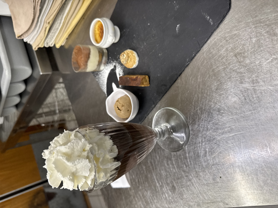 The scene depicts a culinary dessert display on a brushed metal countertop within a professional kitchen environment in Hoenheim, France. In the foreground, a tall, fluted glass goblet contains a dark brown dessert, likely chocolate mousse or pudding, generously topped with white whipped cream. To its right, a rectangular black slate serving board presents five individual desserts. From left to right on the slate, these include: a small white bowl holding a scoop of light brown ice cream; a small, rectangular piece of light brown cake or pastry; a small, domed white dessert with a partially golden-brown torched top; a small clear glass containing a layered dessert resembling tiramisu, topped with cocoa powder; and an ornate white ceramic ramekin holding crème brûlée with a visible caramelized sugar crust. A dusting of white powdered sugar is scattered across the central area of the slate board. The background reveals additional stainless steel surfaces, a stack of beige cloths or napkins, and a white plastic container on a metal shelf. No individuals are present in the image.