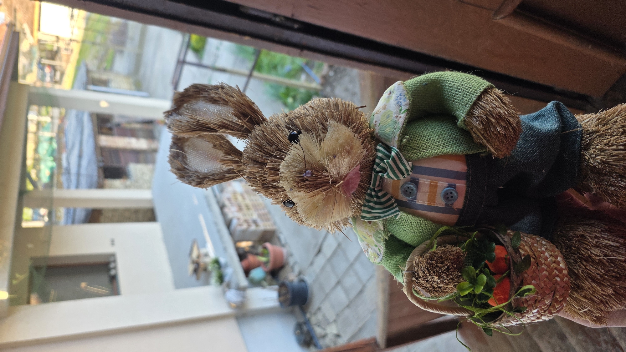 A straw rabbit toy stands indoors with an outdoor setting partially visible in the background
