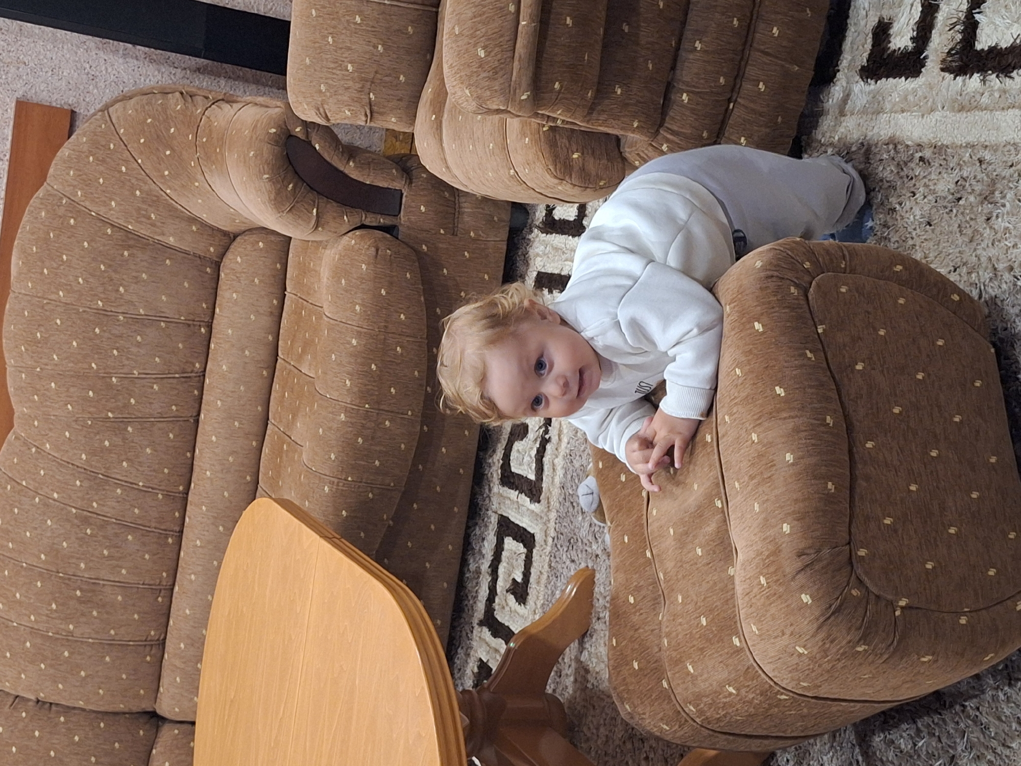 The scene depicts an interior view of a residential room in Simitli, Bulgaria. A fair-skinned child with light blonde, curly hair and blue eyes is positioned in the foreground, kneeling on a shaggy light-beige rug with a brown geometric pattern. The child wears a white long-sleeved top, partially revealing the word "JUST" on the left chest area, and light grey pants. The child's hands rest on a brown upholstered ottoman, which features a subtle lighter-colored dot pattern. The child's gaze is directed towards the viewer, with a slight smile on their face. In the mid-ground, a large, brown upholstered sofa with the identical dot pattern is situated behind the ottoman and child. A portion of a matching brown upholstered armchair is visible to the right of the child. To the left, a light brown wooden coffee table with a curved top and a pedestal base is partially visible. The background wall exhibits a light-colored, textured finish, with a horizontal wooden trim running above the sofa. A vertical dark object is partially visible on the far right edge of the frame.