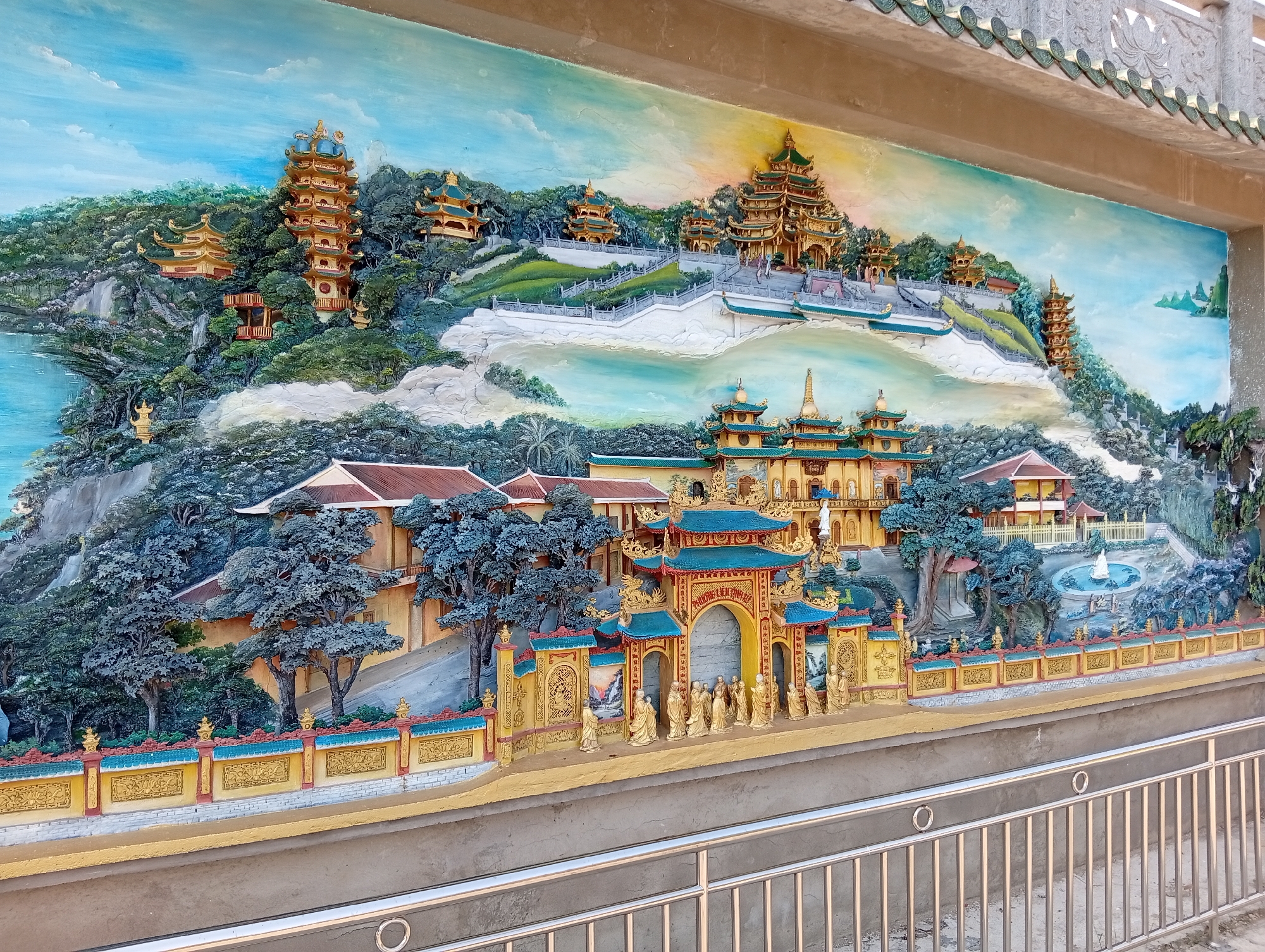 A large, detailed three-dimensional relief mural is displayed on a wall in Phú An, Vietnam. The mural depicts a sprawling, multi-tiered temple complex integrated into a mountainous and heavily forested landscape under a sky that transitions from light blue to a warm orange-yellow hue. In the lower section of the mural, a grand, ornate archway with a teal-colored roof and prominent golden decorative elements is featured. Approximately 15-20 golden-robed figures, consistent with Buddhist monks or devotees, are sculpted in a procession, appearing to walk towards or through this archway. Flanking the archway are elaborate yellow walls with intricate golden relief patterns. Behind these, buildings with red-tiled roofs and yellow walls are visible, surrounded by sculpted trees with dense, blue-green foliage. A circular fountain containing a white figure is depicted in a courtyard to the right. The midground portrays a broad, white staircase ascending a green hillside, leading to further temple structures with teal roofs and golden accents. A calm body of blue water is present on the far left. In the background, multiple multi-story golden pagodas and a large temple complex with prominent teal and gold structures crown the higher peaks of the mountains. The entire mural is framed at the top by a concrete overhang featuring green roof tiles and carved lotus motifs. A modern metal railing is visible in the immediate foreground, outside the mural itself.