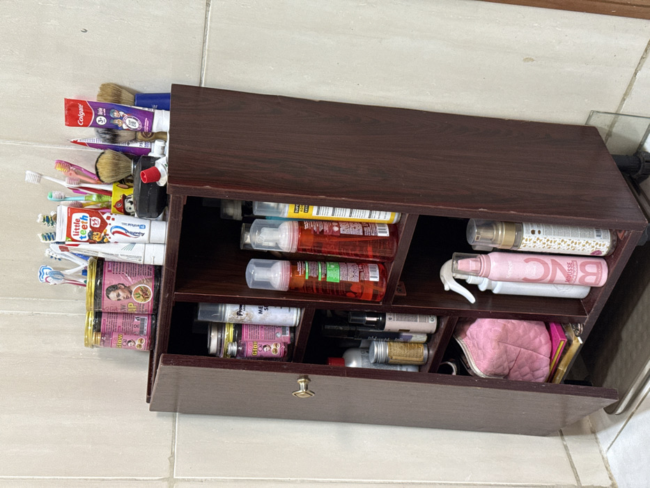 - "A dark brown, multi-compartment wooden storage cabinet, potentially on wheels, stands against a light-colored tiled wall" by FM-Aszrs1, licensed under CC BY 4.0