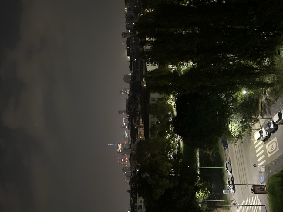 This elevated night photograph captures a detailed urban landscape in Milan, Italy, featuring a panoramic view towards the modern Porta Nuova and CityLife business districts. The sky is dark and fully overcast, with a faint light source visible in the upper-left cloud formation. In the distant skyline, numerous illuminated skyscrapers are visible, dominated by the UniCredit Tower in Porta Nuova, prominently lit with blue and white accents. Other modern high-rise buildings, including what appears to be the Bosco Verticale, dot the horizon, displaying various city lights and red aircraft warning beacons. The mid-ground is occupied by a substantial urban park, characterized by dense, dark tree canopies. Portions of the park are illuminated by yellow-green streetlights, revealing pathways and foliage. Beyond the park, multiple multi-story residential or commercial buildings are visible, their windows glowing, with one structure on the far right featuring a distinctive spire or cupola topped with a red light. The foreground presents an asphalt road with visible tram tracks, curving from left to right. A white pedestrian zebra crossing traverses the road. On the left side of the road, two white hatchbacks and a dark blue sedan are parked. On the right side, a white van, a dark grey compact car, and another white compact car are parked perpendicular to the curb. A circular "30" speed limit marking is painted on the road. Multiple streetlights emit bright yellow-green illumination across the road and into the park area. A dark red kiosk or information stand with a poster is located on the left sidewalk. No individuals are discernible within the frame.