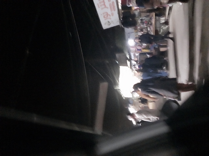 A nighttime view captures a bustling street scene. Pedestrians stroll and browse shops illuminated by bright lights. A sign with lettering is visible. Power lines crisscross the sky above. The perspective is somewhat tilted, and a vehicle component is in the foreground.