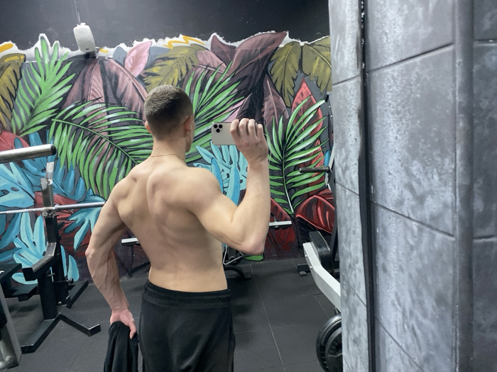 The scene depicts the interior of a gym in Novi Sad, Serbia, captured as a reflection in a large mirror. The primary subject is an adult male, observed from the back, shirtless, with a muscular physique visible in his back and arms. He has short, light-colored hair and wears dark athletic shorts, along with a thin gold chain around his neck. He is actively taking a selfie, holding a light-colored smartphone with his right hand, extended over his shoulder, pointed towards the mirror. His left hand holds a folded dark garment, likely a shirt. The background features a prominent mural covering the wall behind the subject, depicting large, stylized tropical leaves in various shades of green, dark red, teal, and brownish-yellow against a dark, possibly black, background. To the left of the subject, a silver barbell is resting on a black weight rack. To the far right, a section of a dark gray, textured wall or pillar is visible, along with a portion of a white and black gym machine. The floor is covered with dark rubber matting. An overhead light fixture is reflected near the top center of the image.