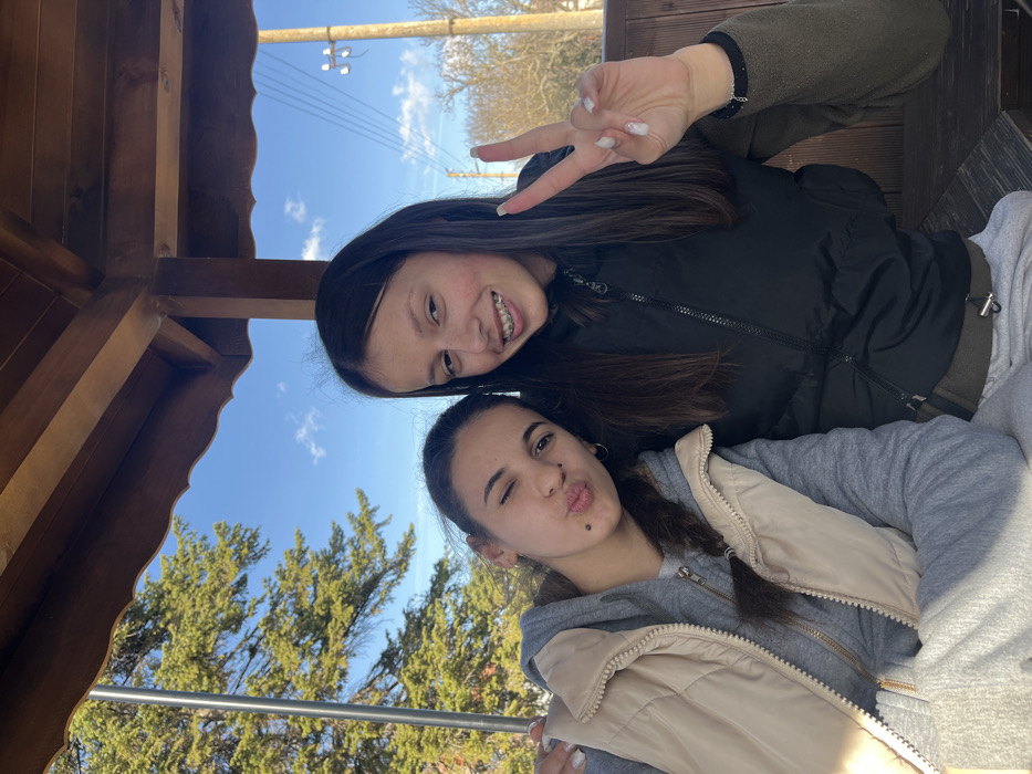 Two young females are seated on a dark brown wooden bench, positioned under a corresponding wooden overhead structure, in an outdoor setting in Lozarevo, Bulgaria. The female on the left, with dark hair, wears a grey hooded sweatshirt layered under a light beige puffer vest. She winks her left eye, pouts her lips, and exhibits a small dark mole on her upper lip and a piercing on her right nostril. The female on the right, also with dark hair, wears a black puffer vest over an olive-green long-sleeved garment and light grey sweatpants. She smiles, revealing dental braces on her upper teeth, and extends her right hand upward, forming a V-sign with two fingers. Her fingernails are long and painted with a light color and subtle design. The background consists of a clear blue sky with minimal white clouds, green coniferous trees on the left, and bare deciduous trees with a utility pole and wires on the right.
