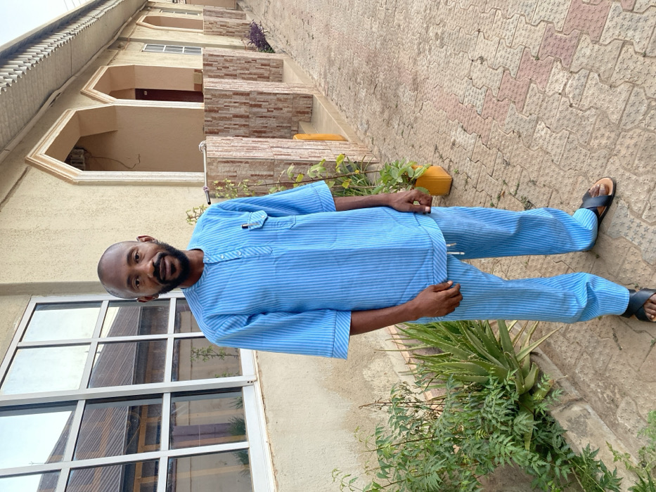 A man in a blue, striped traditional outfit poses outdoors. He wears black sandals. Behind him, there is a beige building with arched windows and a red door. The building has brick detailing on the façade. In front, there is a mixture of plants, including ferns and aloe. The ground is paved with a red and white geometric pattern. The photo is slightly tilted.