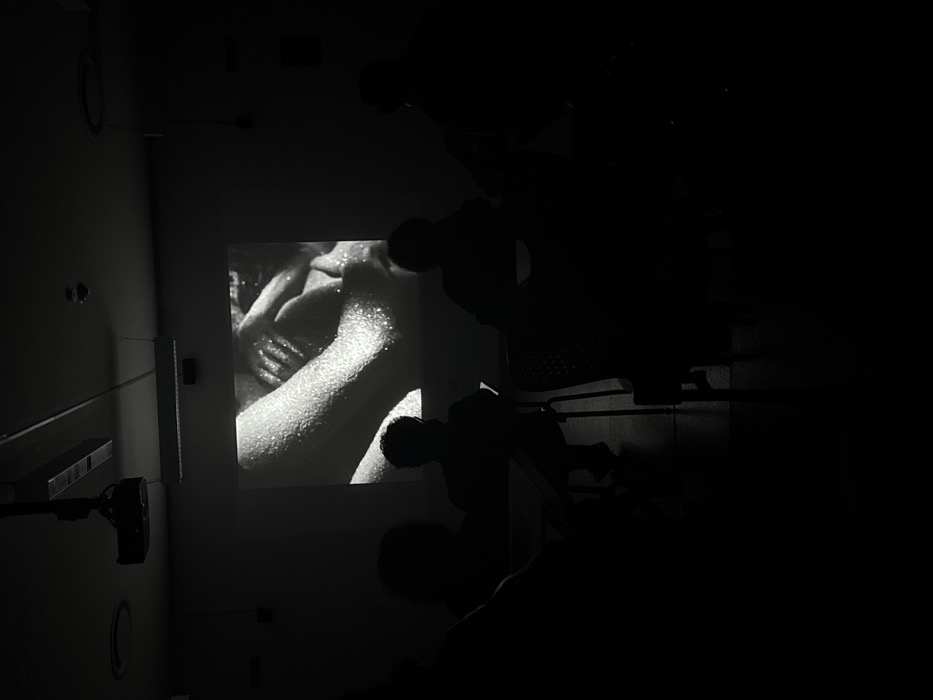 In a dimly lit room, a monochromatic image is projected onto a stark white wall. The image appears to depict skin, possibly a torso or arm, glistening with water droplets. Several figures are seated in the darkness, their silhouettes facing the projection. A few structural elements, such as what appears to be part of a shelving unit and a circular vent, are visible against the left wall. The scene exudes an atmosphere of focus and intimacy, though the image details are partially obscured by the overall darkness.