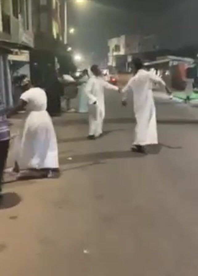 group of people in white robes dancing in the middle of a street at night. There are at least five individuals visible, including three in the foreground who are most prominent in the frame. The street is paved and lined with buildings. Street lights are visible. There is a large speaker system set up on the side of the road, presumably providing the music. The video is shot from a slightly low angle, with the camera following the dancers as they move.