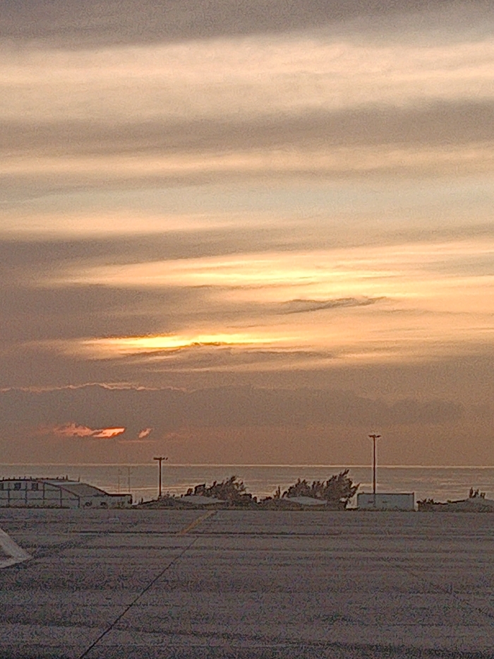 A wide shot shows a sunset horizon above a sandy ground surface. The sky exhibits streaks of orange and gray clouds, with a bright horizontal band of sunlight. In the distance, faint buildings and telephone poles dot the line where land meets the water. Sparse vegetation grows nearby. A section of an airplane wing is visible in the lower left.
