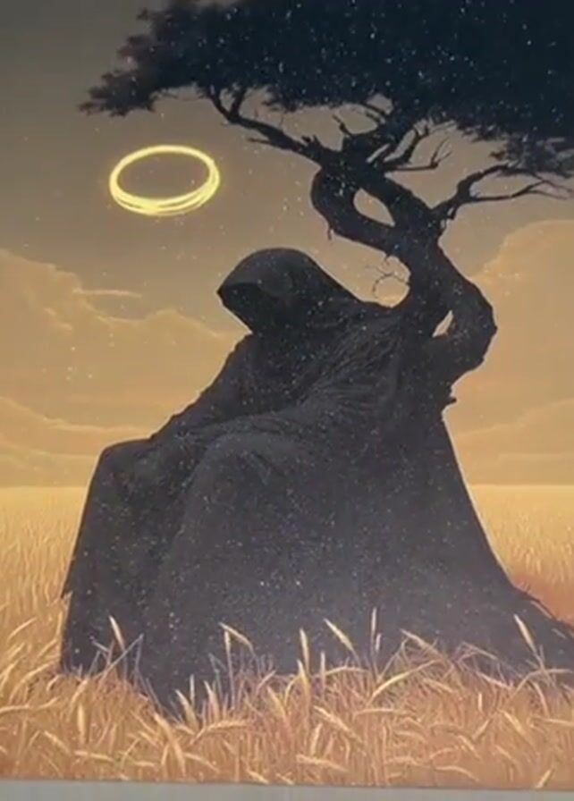 - "close-up of a painting depicting a cloaked figure sitting under a tree in a field" by FM-vvEsp1, licensed under CC BY 4.0