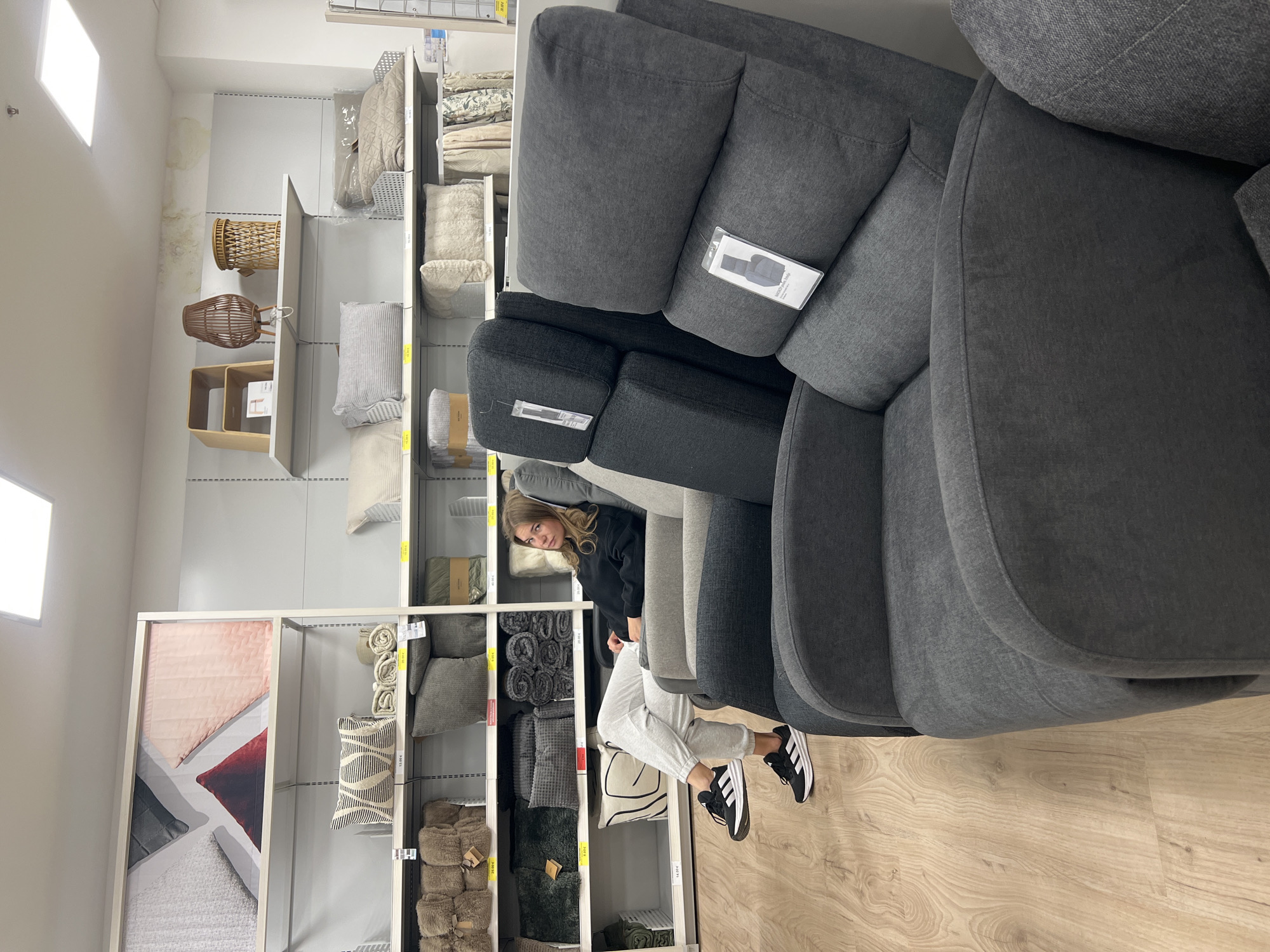 The scene depicts an interior view of a home goods retail store, located in the city of Dub, Montenegro. A young adult female is seated comfortably in a light grey recliner chair, positioned slightly off-center to the left. She has light brown hair, is wearing a black long-sleeved top, light grey joggers, and black Adidas sneakers with white soles. Her legs are crossed at the ankles, and she looks directly at the camera with a neutral expression. In the foreground and midground, several upholstered recliner chairs are arranged. Two darker grey recliners are visible immediately to the right of the seated woman, with white product information tags attached. The floor is covered with light wood-look laminate flooring. The background features a white modular shelving system lining the wall, filled with various home furnishings. These include multiple decorative cushions and pillows in shades of grey, beige, and cream, some with textured or patterned finishes. Rolled and folded blankets and throws are also displayed on the shelves. Above these, additional shelves hold decorative items such as a light wooden two-tier stool and two woven basket-like structures. Price tags in Euros are visible on several items. Above the shelving system to the left, a large rectangular display features images of four pillows. Above the shelving system to the right, near the ceiling, a distinct area of light brown discoloration is present on the white wall, indicating a stain. The ceiling is white with square recessed LED panel lights.