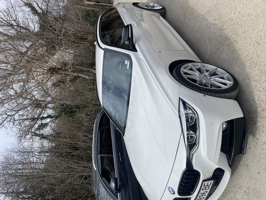 A white BMW 3 Series F31 Touring wagon, equipped with a black front grille, LED "angel eye" headlights, a black lower front splitter, roof rails, black side mirrors, and custom multi-spoke silver alloy wheels, is parked on a light gray paved surface