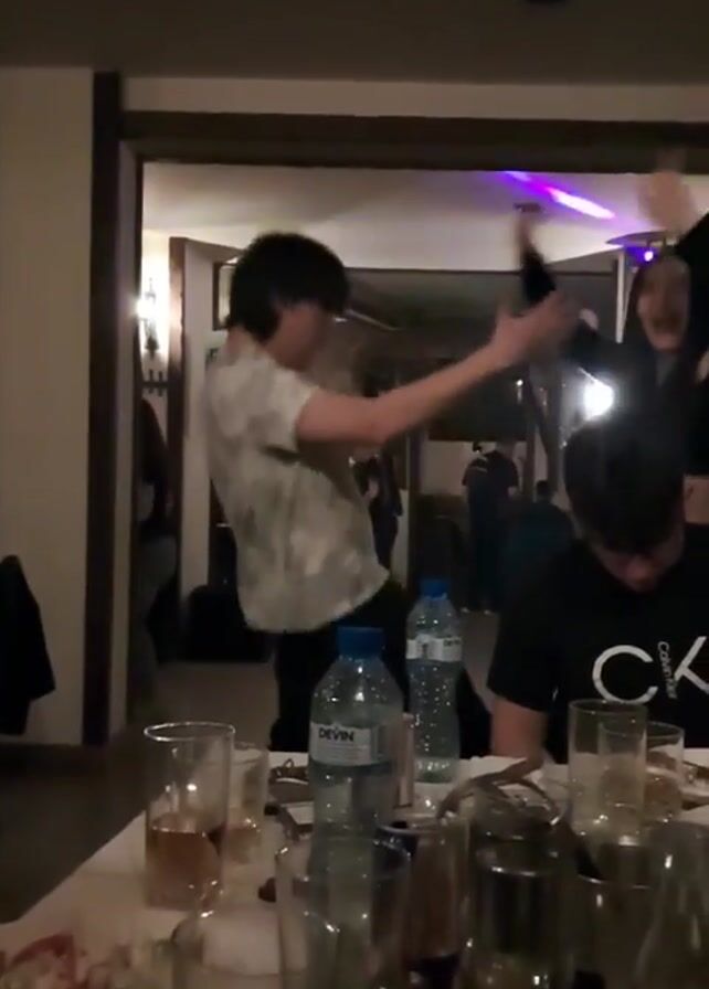 restaurant setting. On the table in the foreground, there are used glasses, plates, and two bottles of water. In the background, a man in a light-colored patterned shirt dances next to a woman with long, dark hair. Another person is seated at the table wearing a black t-shirt with "CK" printed on it. Other patrons can be seen through the doorway. A sound system with speakers is visible in the background. An arm passes in front of the camera a few times. Overall, the scene appears to be a lively gathering in a restaurant.