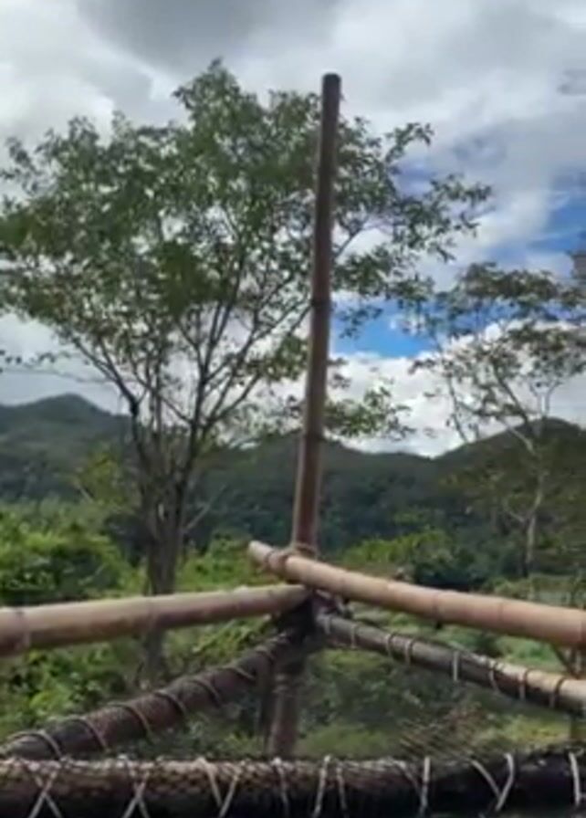rural view from an elevated platform made of bamboo and netting. A tall bamboo pole rises vertically in the foreground, while other bamboo pieces form a horizontal structure covered in black netting. The background features a lush green landscape of trees and rolling hills under a cloudy sky with patches of blue. There are no people visible in the video. The camera slowly pans from left to right. Electronic music can be heard.