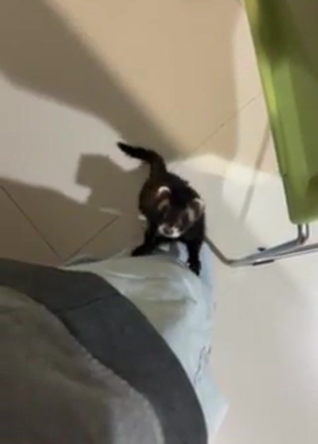 A ferret jumps around the legs of a person sitting in a chair