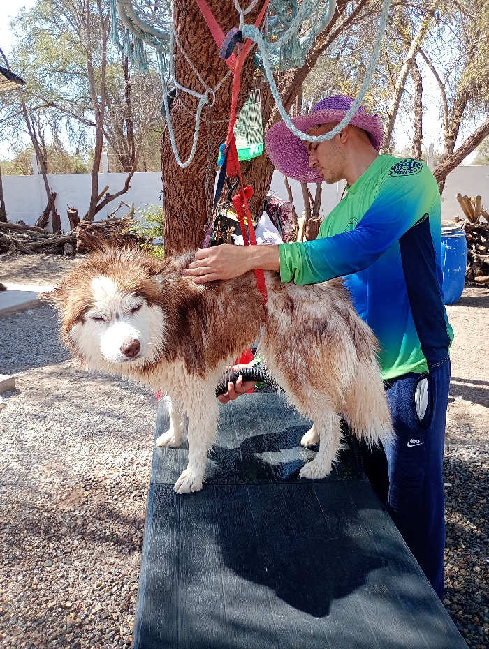 A man in a purple hat and blue-green shirt grooms a wet, brown and white Alaskan Malamute dog on a black table. The dog stands patiently while the man pets its back. A tree behind the dog has ropes and colorful objects hanging from it. The area is outdoors, with a gravel ground and trees in the background.