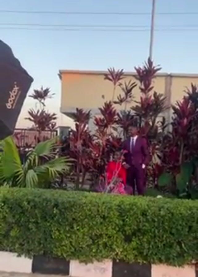 The scene is an outdoor photoshoot. A couple is posing among plants; the woman is wearing a red dress, and the man is wearing a purple suit. A black softbox on a stand, labeled "Godox", is positioned to their left. A photographer, wearing a black t-shirt and cap, is taking pictures. Another light modifier, an umbrella, is set up nearby on a stand. In the background, there is a building, a tall pine tree, and a security camera mounted on a pole. The ground is paved with light-colored brick. The sky is light blue. The photographer gives directions to the couple.