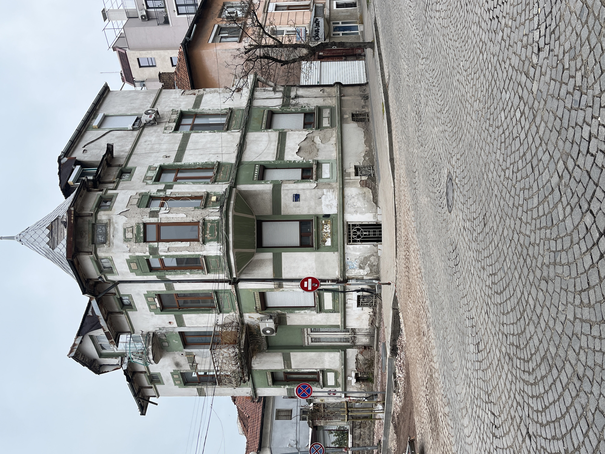 The image depicts a street corner in Plovdiv, Bulgaria, featuring an old, multi-story building under an overcast sky. The central building, positioned at the corner, exhibits a state of disrepair with peeling white and green paint, cracked stucco, and visible water damage. Architectural elements include a prominent corner turret with a conical metal roof, ornate metal railings on two balconies (a larger, detailed one on the first floor and a smaller, simpler one higher up), a bay window, and brown-framed windows, some fitted with external white roller shutters. An inscription "1912" is visible above the lower balcony. Two external air conditioning units are affixed to the facade. To the immediate left, a portion of an older building with a red tile roof and a lighter facade is visible. To the right, an adjacent peach-colored building with a red tile roof and a large white roller shutter door on its ground floor stands next to the main structure. Further in the background, a newer, taller building with modern balconies and a flat roof is partially visible. The street is paved with grey cobblestones arranged in a distinct fan-like pattern. The sidewalks are concrete, with an area near the corner showing disturbed ground, exposed soil, and construction debris, suggesting ongoing work or neglect. Several circular traffic signs are present on poles near the corner, including "No Entry," "No Stopping," and "No Parking." A bare deciduous tree stands on the sidewalk to the right, while smaller saplings are protected by barriers on the left. Overhead power lines crisscross the scene. No individuals are present in the frame.