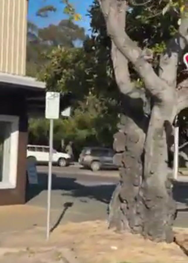 street scene with a roundabout ahead. A white Toyota Land Cruiser is parked in front of a single-story building with a beige corrugated metal exterior. There is a tree on the right side of the street. A roundabout ahead sign with a red border and black arrows in a triangular shape is visible. Another car is parked farther down the road. The sky is clear and blue.