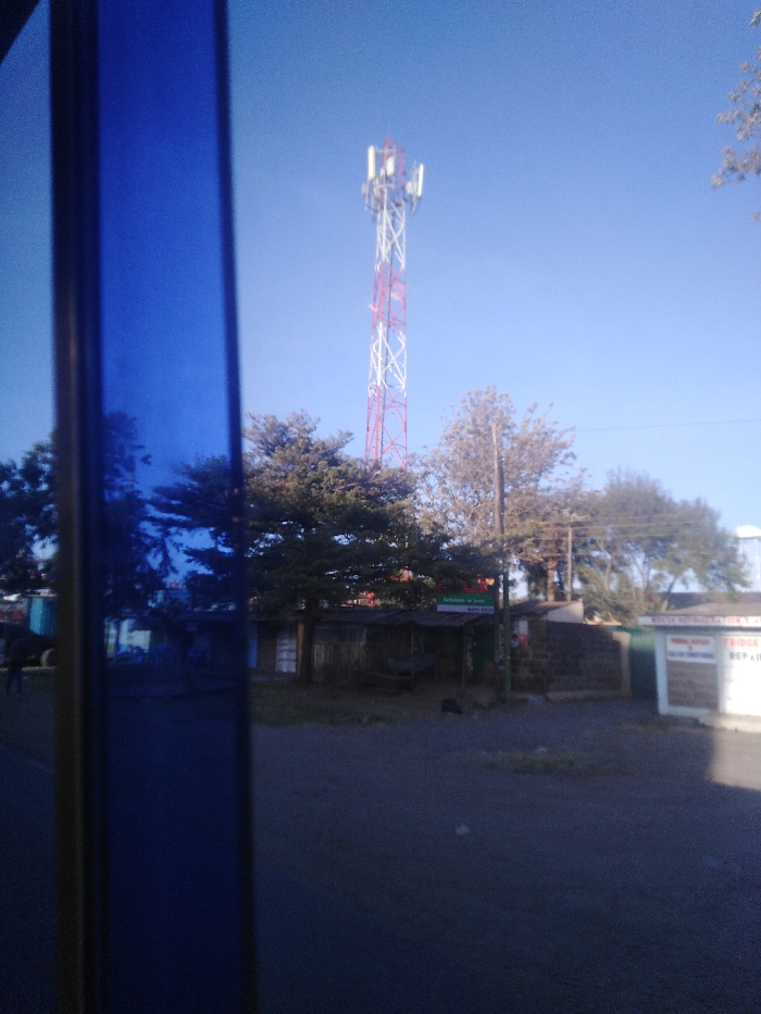 A tall, red and white cellular tower rises behind trees under a clear blue sky. The view is partially obscured by a blue, reflective surface. A low building with a dark awning and green signage sits at the base of the trees. A dusty road is in the foreground. A single-story structure with painted signage stands to the right. The scene appears to be captured through a window.