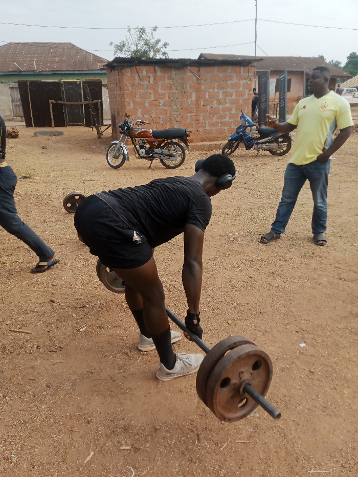 In Akwanga, Nigeria, an outdoor scene depicts three individuals and various objects on a reddish-brown dirt ground under an overcast sky. In the foreground, a dark-skinned male, wearing a black t-shirt, black shorts, black socks, white athletic shoes, black headphones, and black gloves, is bent at the waist, holding a barbell with two rusty metal weight plates on each side, appearing to perform a bent-over exercise. To his immediate left, the lower body of another individual in dark pants and blue flip-flops is partially visible, moving towards the left. To the right, a third dark-skinned male stands upright, facing the exerciser, wearing a yellow short-sleeve shirt, blue jeans, and dark sandals; his left hand is in his pocket, and his right hand is extended in a gesturing motion. In the midground, two motorcycles are parked: an older brown model to the left and a blue scooter to the right. The background features several low-rise buildings: a light-colored structure with a dark corrugated roof and large dark panels on the left, an unplastered red clay brick building in the center, and a partially obscured lighter-colored building to the right. Sparse green vegetation is visible between the structures.