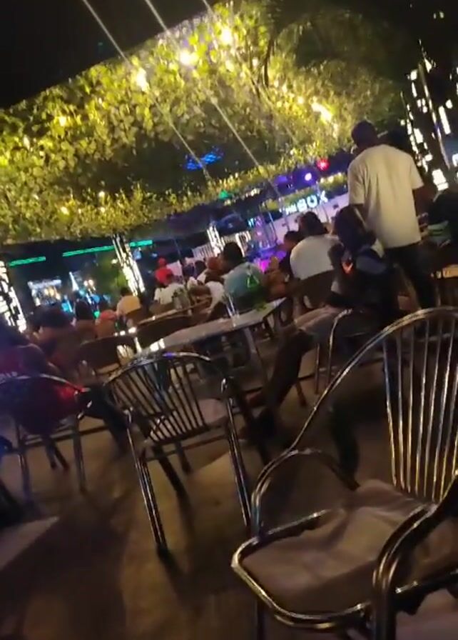 The video depicts an outdoor restaurant or bar at night