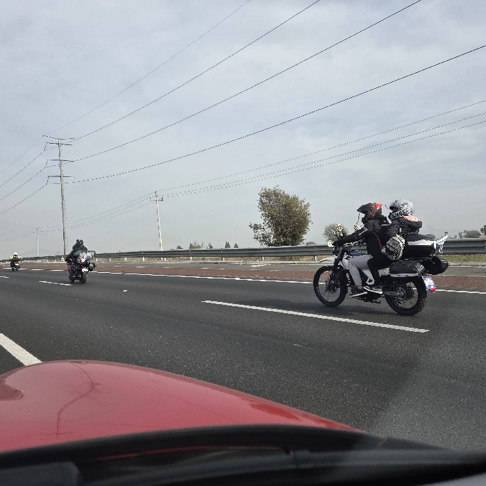 A highway scene under a muted sky. The viewpoint appears from inside a car, indicated by the blurred red dashboard. Several motorcycles are traveling along the road. One prominent motorcycle carries two helmeted riders, equipped with luggage racks and bags. The remaining motorcycles are farther ahead. Overhead, a grid of power lines stretches across the sky. The roadside features a safety barrier and some sparse vegetation.