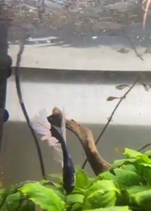 - ". The video shows a Betta fish in an aquarium. The fish is black and white, with a long, flowing tail. The aquarium is decorated with green plants and a piece of driftwood. Several red shrimp are also swimming around in the tank. A person's hand appears to drop food into the aquarium." by FM-PFEbq2, licensed under CC BY 4.0