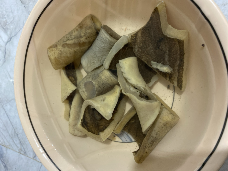 A bowl holds a collection of tubular and triangular shapes, seemingly of organic origin. They are predominantly light in color, with darker brown or grey markings concentrated on the inner surfaces of the open shapes. Some pieces are rolled into short cylinders, while others are flat, forming hollow triangular outlines. They appear to be slightly wet, immersed in a small amount of liquid within the bowl. The overall presentation is clean, with a slight sheen visible on the surfaces of the shapes.