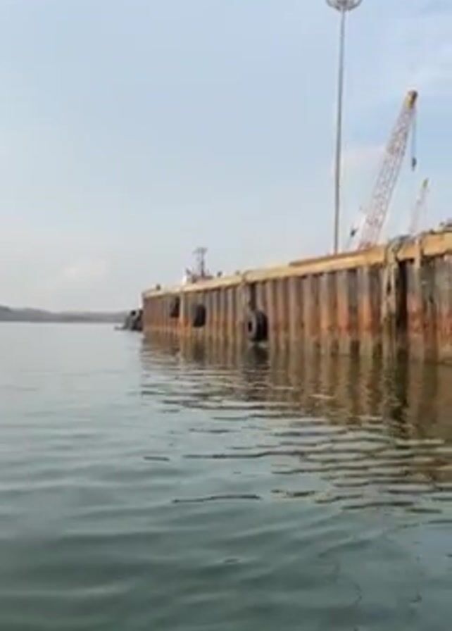 waterfront scene with a rusty, metal pier