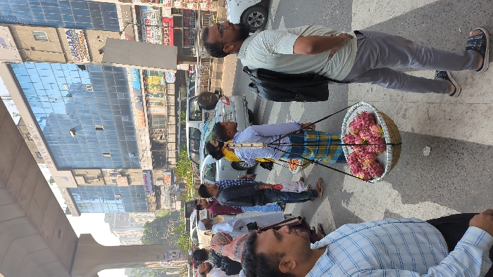 A crowd stands near a busy street with cars. A vendor carries a basket of red flowers on a bamboo pole. A man wearing glasses and a backpack stands beside the vendor, looking up. Buildings with glass windows and signage are visible in the background, as well as an elevated train track. Some people are wearing traditional clothing.