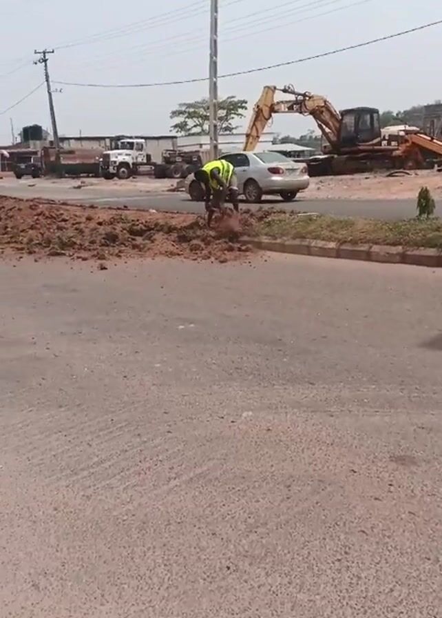 man working on a road construction site. He is wearing a neon yellow vest and is using a shovel to clear dirt and debris from the road. In the background, there is a silver car parked on the side of the road, and an excavator and other construction vehicles. A telephone pole is in the background. The road is a paved surface. The weather appears to be overcast.