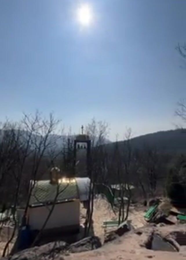 sunny outdoor scene. A small building with a gold-colored roof is visible, along with a tower-like structure in the background. The surrounding landscape features trees without leaves and green trees farther away. The foreground has a rocky terrain. No people are visible in the video. The sun shines brightly in the clear blue sky. There is a slight camera movement as it pans from left to right.